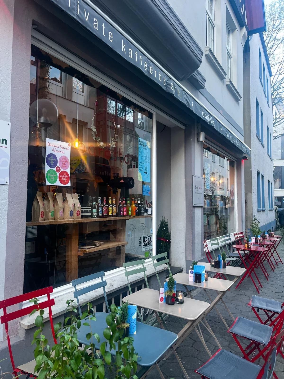 Angeschlossen an unsere Rösterei ist ein kleines liebevoll eingerichtetes Cafe, in dem Sie unseren frisch gerösteten Kaffee und einen passenden süßen oder auch herzhaften Begleiter, wie Nußecken, Mandelbögen, verschiedene Cookies, Muffins, Paninis und Foccacias genießen, sowie dem Röstmeister bei der Veredelung des Kaffees über die Schulter schauen können.